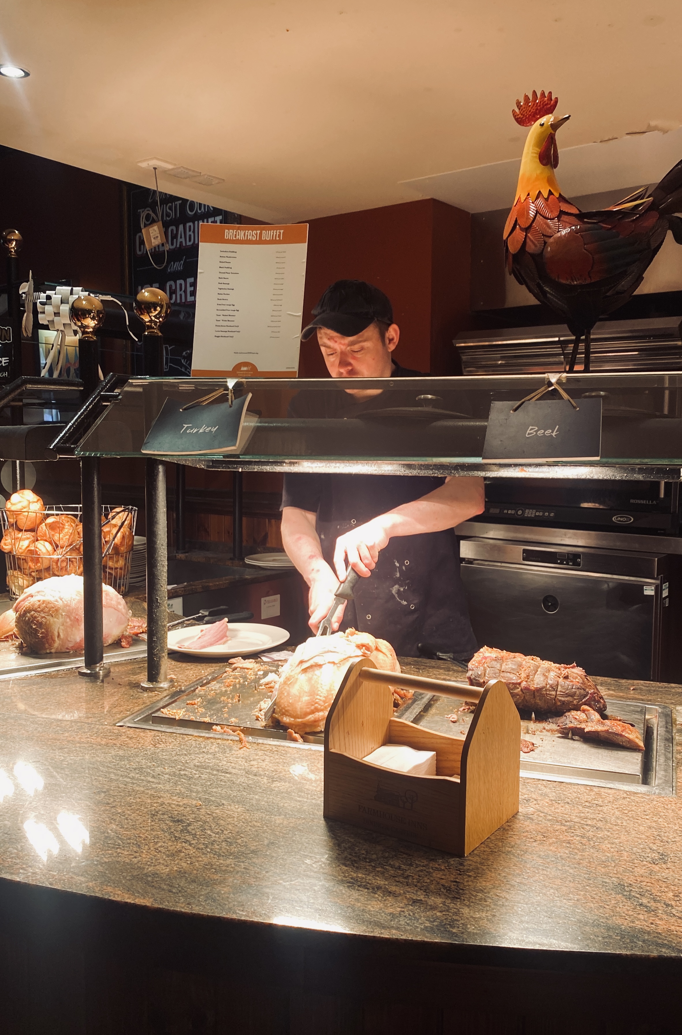 We stopped for a late lunch at Juniper Farm. It was the first time I ever heard of or experienced a carvery but it was such a fun concept. They had a standard menu you could order from as well, but for £10 or so, you could get a Carvery. You would go to the counter and choose your meats, which the carver would carve for you on the spot. They had turkey, beef, and gammon (ham). He would also pop a Yorkshire pudding on for you, then you’d go down the line and add everything else you wanted. There was a whole row of roasted vegetables in the most darling cast iron pots. Parsnips, potatoes, cabbage, carrots, peas, and broccoli were some of the options. After that, there were several gravies you could ladle on top. At the very end there were sauces you could add for dipping as well. Some of those were English mustard (very sharp), mint sauce, and cranberry sauce.