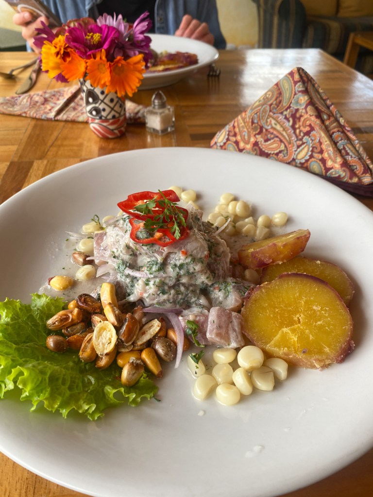 We still hadn’t tried one of the quintessential Peruvian dishes, ceviche, so the chef at IntiRumi Inn said he would make it for us for lunch before we left. He offered to let us watch him make it, but I knew I probably wouldn’t be able to eat it if I watched the poor fish being diced and tossed in lemon juice mere minutes before being put on my plate. It was bursting with my favorite flavors (onion and cilantro) and I was so glad we got to try it, but I could only eat so much before the chunks of fish started to look a little too fresh. The white sweet potatoes and fresh and toasted corn he served with it were delicious.